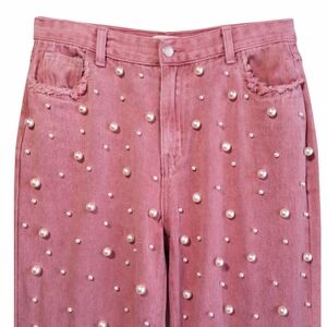 Stylish POL pink pearl embellished jeans featuring a flattering high-rise fit and straight leg silhouette. These statement jeans are detailed with scattered pearl embellishments across the front for a unique glam look that instantly elevates any outfit.