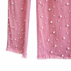 The soft pink wash paired with dimensional pearls makes these perfect for dressing up with heels or styling casually with sneakers or a sweater.