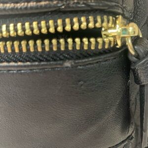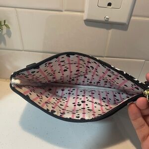Chic black backpack with heart quilting. Gold-tone zipper and logo. Matching wristlet with playful script design. Both are included in the sale.
