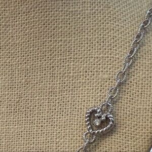 Stylish silver 18” length necklace by Judith Ripka. Features heart-shaped accents with bezel-set Diamonique and textured links.