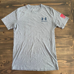 Men’s Under Armour Freedom short-sleeve tee in gray, size Small (SM/P/CH). Features a dark blue UA logo with “FREEDOM” on the front, an American flag graphic with UA logo on the back, and a small flag graphic on the right sleeve.