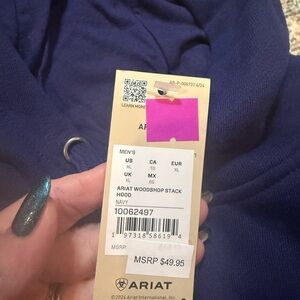 Experience comfort with the Ariat deep blue pullover hoodie. Features a front pocket and subtle logo detail.