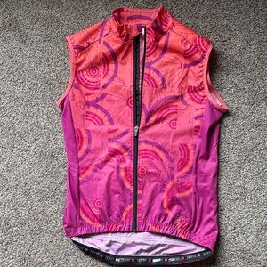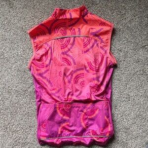 Vibrant sleeveless top by Terry. Features a striking pink and orange pattern (Peacock). Perfect for active wear. Terry’s top selling Breakaway Mesh Sleeveless Jersey offers an amazing array of cycling features, offers UV and anti-microbial protection that’s woven into the fabric (won’t wash out like other fabric finishes) and gives you added ventilation with mesh side paneling. Relaxed fit.