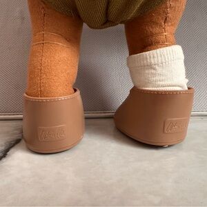 This adorable plush doll features a soft tan body and a stylish green outfit, perfect for playtime and cuddles.
