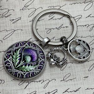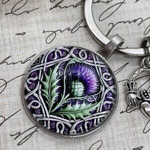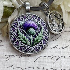 Embellish your everyday essentials with the Scottish Thistle Keychain, a charming accessory that combines practicality with a touch of elegance. Crafted with meticulous attention to detail, this keyring features a beautiful resin cameo with a thistle design, accented with beaded embellishments that catch the light for a subtle sparkle.