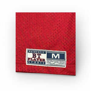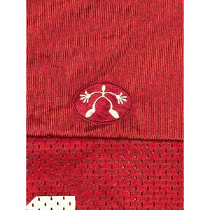 This is a pre-owned red and white football jersey, size M, from BT Player Sports. The front features "SOONERS" above the number "45" in white. The number "45" is also visible on the back and shoulders. The jersey has a V-neck and a mesh-like texture. A small embroidered logo is present on the upper chest. The care tag indicates "AUTHENTIC BT PLAYER SPORTS" and "100% POLYESTER," with washing instructions and "MADE IN U.S.A." The jersey measures approximately 28 inches in length and 20 inches across the chest.