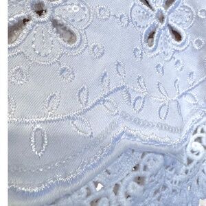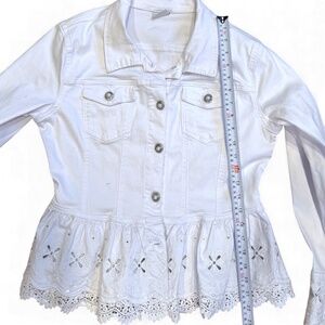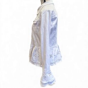 Beautiful and feminine white denim jacket by ONADO Paris featuring a delicate eyelet lace peplum hem and lace-trimmed cuffs. Sparkling sequin accents are scattered throughout the embroidered lace for a subtle shimmer. Flattering fitted style with silver rhinestone-style buttons for an elegant finish.