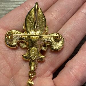 Elegant gold and red fleur-de-lis brooch with intricate detailing and tassel accent.