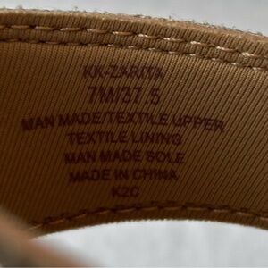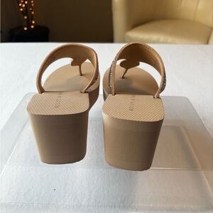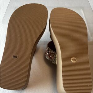 NWOT Kelly & Katie Wedge Sandals. They feature a 3” wedge heel, tan footbed, and bronze & clear rhinestone embellishments across a wide strap and circular toe detail.