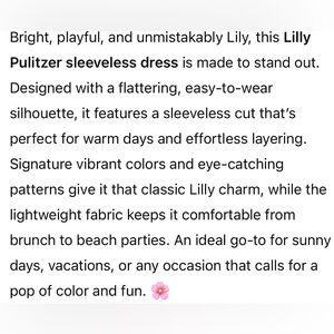 Bright, playful and unmistakably Lilly Pulitzer. Designed with a flattering, easy to wear silhouette. The sleeveless cut is perfect for warm weather and effortless layering. Signature eye-catching colors and patterns give it the classic Lilly Pulitzer charm. Comfortable for brunch to beach parties.