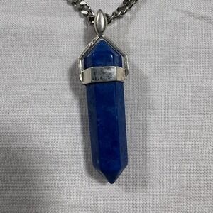 A striking blue crystal point pendant necklace with a silver tone chain. The faceted hexagonal pendant showcases a vibrant blue gemstone, suspended from a sturdy curb chain. This necklace adds a touch of elegance and natural beauty to any ensemble, perfect for everyday wear or special occasions.