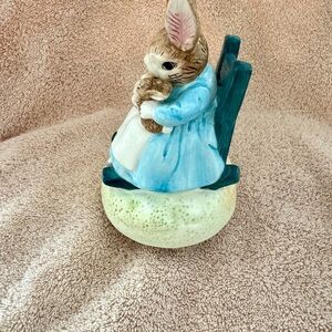 Sweet Mrs. Rabbit from Beatrix Potter sits in a rocking chair and holds twin bunnies. This ceramic figurine is a music box that plays Brahms Lullaby. In perfect condition. Lovely baby gift, especially for the mother of twins, or for any collector.Made by Schmid, Germany.