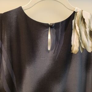 Elegant sleeveless black dress featuring a striking beaded neckline. Accented with blue and green floral patterns.