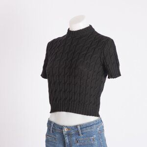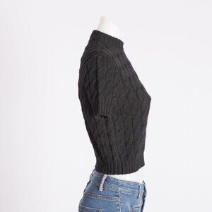 This black short-sleeve sweater from Krizia Maglia is made from 100% wool and features an allover cable-knit pattern for texture and structure. It has a ribbed mock-neck collar, fitted silhouette, and cropped-to-waist length that pairs well with high-rise denim, tailored trousers, or skirts. Ribbed sleeve cuffs and hem provide a polished finish while maintaining stretch and shape. The streamlined cut works for layering under blazers or wearing on its own in transitional seasons. A versatile knit suited for minimalist wardrobes and designer capsule collections.