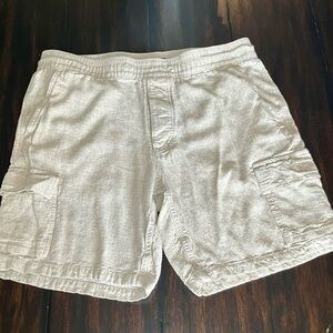 These cream cargo shorts by Kenneth Cole offer a relaxed fit, perfect for warm weather. Crafted from lightweight linen, they provide both comfort and style for any casual outing.