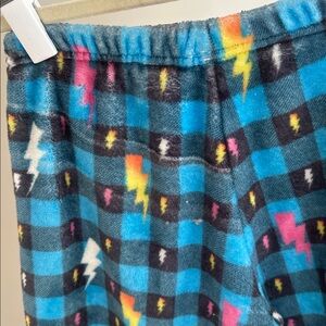 Girls cozy fleece pajama pants feature a vibrant blue with lightning bolt print.