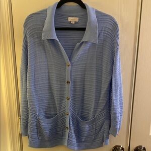 Says size small but I’d say a size medium or a tall small - see measurements. I’m petite small and I feel like it overwhelms me unfortunately. Otherwise, it’s so classy!