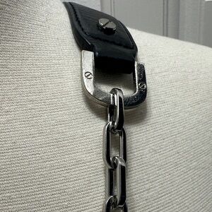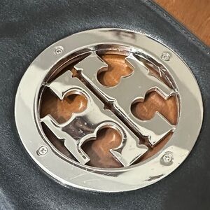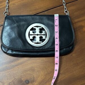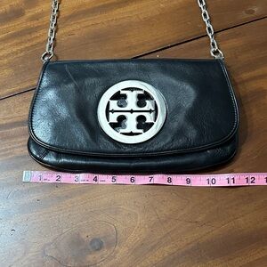 This item is a Tory Burch Reva Clutch, a versatile accessory crafted from black leather featuring the brand's iconic double-T logo in silver hardware A foldover clutch style that often doubles as a crossbody or shoulder bag thanks to a detachable silver chain strap. Sleek and stylish black leather crossbody bag featuring a sophisticated chain link strap. Ideal for elevating any outfit. Use as a crossbody! Clutch! Shoulder bag! Comes with dust bag