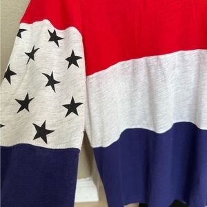 Bold red top with sequin lettering. White middle section with stars on sleeves. Blue bottom. Stylish and comfortable.
