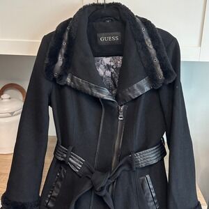 Y2K GUESS Wool Blend Belted Trench Coat Faux Fur Leather Moto Chic Mob Wife Sz L