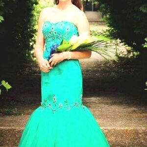 Sherri Hill trumpet style, long, emerald green formal dress. Size 2. Chest from pit to pit 15 1/2", waist measured at smallest part of dress 13", length from center of chest in front to bottom 52". The back has a slight train so around 6 inches longer in back. Heavy satin fabric, fully lined, bottom tulle skirt has lining fabric, covered with layers of white crinoline, with top layer of lining, plus 4 layers of tulle on top of that. Very full at bottom. Refer to photos of a few missing beads and tiny red stain on back. Other than that, excellent pre-owned condition. Worn once. Garment bag included.