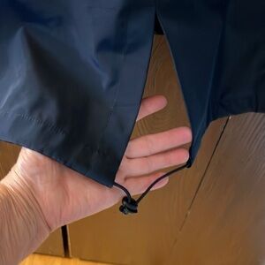 Mondetta long sleeved navy blue hooded windbreaker jacket. Pockets on the sides in the front. High enough to protect your neck from the weather. Front length measures 32.5 and 35 inches long in the back. Size Medium