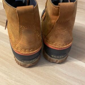 Stylish lace-up boots by Sorel. Features brown leather upper and gray rubber toe. Durable and comfortable.