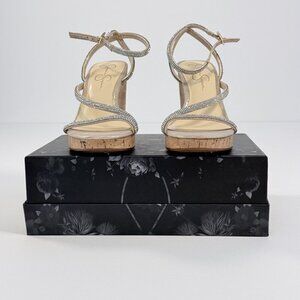 Lovely Jessica Simpson Tenley ankle strap platform wedge sandal, beautifully accented with rhinestone-embellished straps and a charming cork wedge platform. No signs of wear are visible.