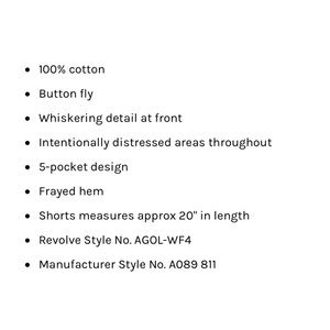 90’s Loose Fit Shorts by AGOLDE. Distressed longline denim shorts with holes and raw frayed hem. Button fly. 100% no stretch rigid cotton. Size 24 in Siren. Pre-loved; good condition - worn about 7x.