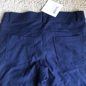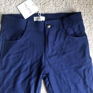 NWT. Made by yelete in a size small. They are navy blue ponte, stretchy leggings. They offer two front pockets and two back pockets and have a zipper and button closure. They measure up to 28 inches in the waist, hips up to 34 inches, the rise, it’s 9.25 inches and inseam is 29 inches. They are made out of 65% rayon, 30% nylon, and 5% spandex.