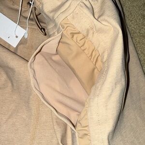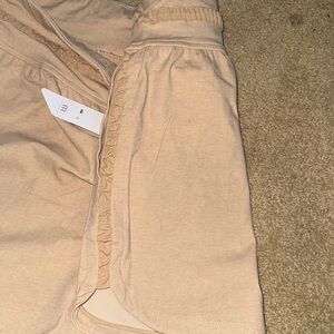 Comfortable tan shorts. Elastic waistband. Casual style.