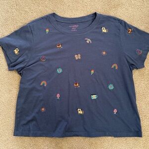 Indigo blue 100% cotton boxy short sleeve crew neck tee with fun favorite things embroidered all over the front and sleeves, 21 inches wide from armpit to armpit, about 21 inches long, straight hem, in excellent condition.