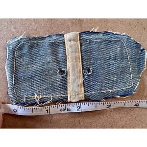 The back of the denim features a reinforced fabric loop and two small holes, suggesting this may have been repurposed as a slide-on belt accessory or a custom uniform attachment. It is perfect for retro styling, DIY denim jackets, or as a specific character prop for cosplay and costuming.