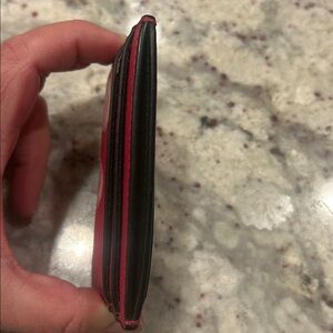 Cute Coach card case, about 2 3/4” X 4”. Two (2) pockets on each side, with a center pocket. Fun hot pink floral print. I cleaned off with Coach cleaner. See a few marks. See close ups. Since print is sort of smudgy itself, (by design), they are not too noticeable.
