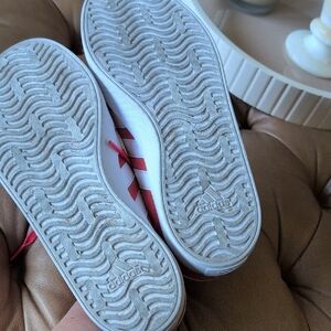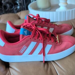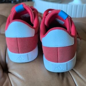 Stylish adidas sneakers in vibrant orange red with white stripes and blue accents. EUC only worn twice. Comfortable and on trend in great color way