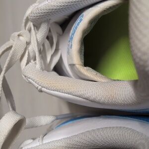 Elevate your look with these Nike sneakers. Crisp white with a bold blue swoosh. Ideal for casual outings.