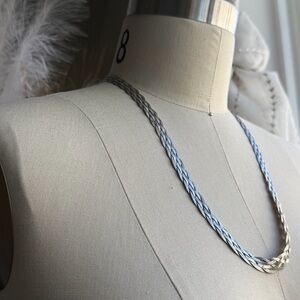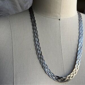 This elegant silver braided necklace adds a touch of sophistication to any outfit. Perfect for both casual and formal occasions.