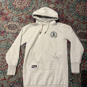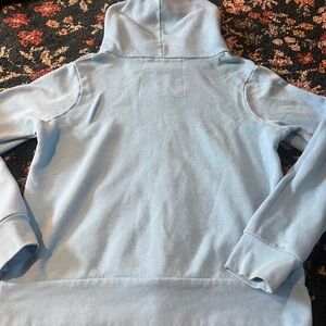 Light blue hoodie with vibrant rainbow stripes. Features front pockets and full zip closure. Comfortable and stylish. No Jaw strings