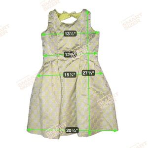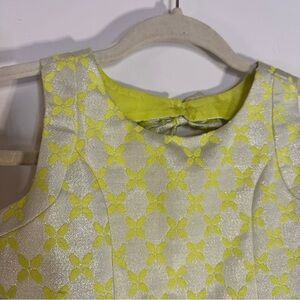 Little Angels by Us Angels sleeveless jacquard party dress in girls’ size 7. Features a vibrant neon yellow and silver floral pattern, structured pleated skirt, and a cute bow-back detail with a hidden zipper closure. Fully lined in matching neon yellow for comfort and fullness.