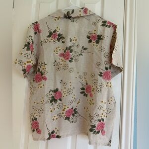 Mileage women's short-sleeve, collared, floral-print blouse. It is made from a linen blend fabric, featuring pink roses and small yellow and gray floral accents on a light-colored cream, background.