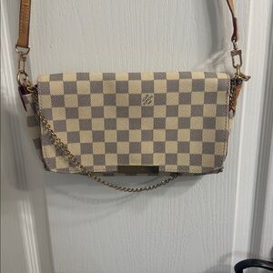 Stylish checkered crossbody bag featuring a tan strap. Perfect for any occasion.
