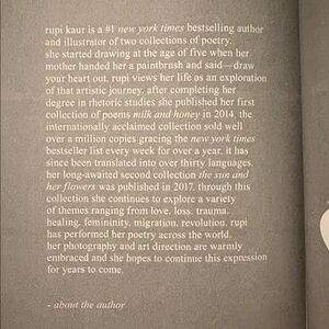 I genuinely thought this book was just going to be about cute inspirational poems but it is much more than that. It's the life story of a person that goes through hardships in life. While reading- I got angry, I cried and I smiled. Definitely recommend it to anyone who wants to feel any emotion.
