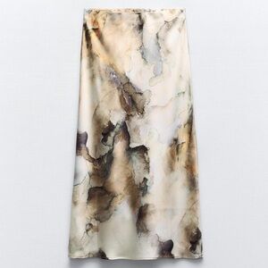 Sleek, fluid tie-dye satin-effect skirt by Zara, featuring a soft neutral abstract print with a subtle sheen. This piece has an elegant slip-style silhouette with an elastic waistband for comfort and an easy, flattering fit.