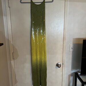 Stunning lime sequin midi dress. Features a sleek halter neckline. Perfect for evening wear.