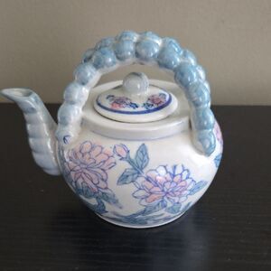 Vintage small ceramic teapot features a beautiful floral design in blue and white and a double handle. This is in great previously owned condition.