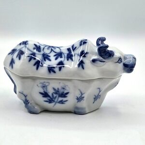 This vintage blue and white cow covered candy dish is a charming addition to any farmhouse-themed decor.