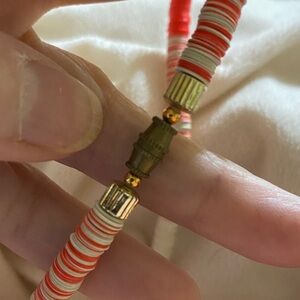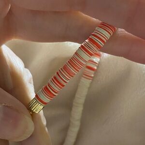 Modern Materials: Today, the term is used more broadly for any small, flat, disc-shaped beads, including those made from vinyl, polymer clay, or gemstones, to create a popular beach or boho style. This stunning necklace features a vibrant blend of red and cream beads, perfect for adding a pop of color to any outfit. Its elegant design makes it a versatile accessory for both casual and formal occasions.