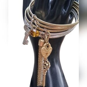 Gold & Silver Tone Charm Bangle Stack - Tassel, Key, & Heart Lock Dangles