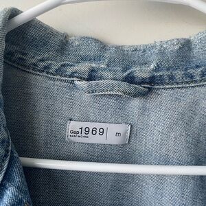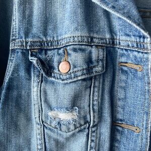 Classic light blue denim jacket. Features button front and chest pockets. Timeless style from GAP. This jacket has has some distressed marks that are photographed. Measurements are below. ⬇️