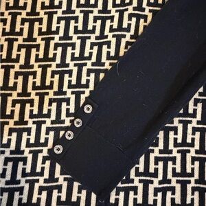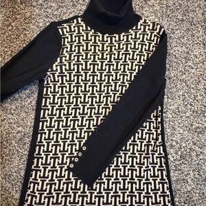 Tommy Hilfiger sweater dress. Buttons on each sleeve, patterned on front and solid black on the back.